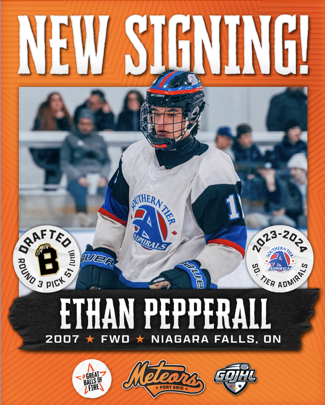 Fort Erie Meteors General Manager Nik Passero announced today that the club has signed forward Ethan Pepperall to a G.O.J.H.L Standard Player Agreement which will run through the 2024-25 season.